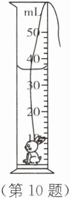 10. 小明测量石头挂件“福兔”的密度. 用天平测得它的质量为 $ 16.8 \text{ g} $,将它放入量筒并倒入适量的水,如图所示. 取出挂件,量筒中剩余水的体积为 $ 30 \text{ mL} $,则挂件的体积为