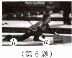 6. 冰壶运动员的鞋底一只是塑料的,另一只是橡胶的. 当她滑行时,橡胶底的鞋比塑料底的鞋受到的摩擦力大. 如图所示,她用 b 脚蹬冰面后,只用 a 脚向右滑行,可以确定的是(