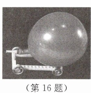 16. 小华利用饮料瓶、气球、瓶盖、吸管等制作了一个简易喷气小车,如图所示.拔掉吸管口的塞子,气球向左喷气,同时小车会向右运动,说明物体间力的作用是
