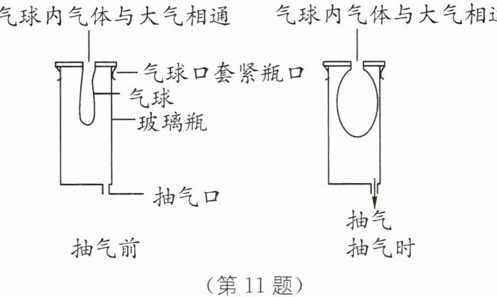 等于 大于 小于 [解析]抽气前气球内外都与大气相通,此时气球内的气体压强与大气压相等;抽气时,气球膨胀说明气球内部气压大于气球外部气压,进一步说明瓶内的气压减小,小于大气压.