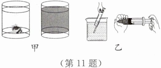 11. 晓雯将几滴蓝墨水滴入一杯水中,如图甲所示. 观察到整杯水慢慢变蓝. 这种现象说明分子在做永不停息的