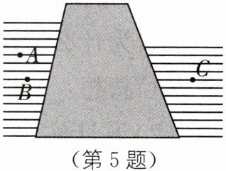 5. 如图所示为长江某水坝的示意图.水坝左侧水面高,B和C两点处于同一高度,A和C两点到各自液面的距离相等,水在A、B和C三点产生的压强分别为$p_{A}$、$p_{B}和p_{C}$,则(