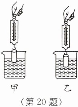 20. (12分)小明在探究“浮力的大小与哪些因素有关”实验时,将一底面积为$4cm^2$的圆柱体浸入水中,改变其浸入水中的体积,观察弹簧测力计示数的变化,如图所示.图甲中,圆柱体有1/4体积浸入水中,弹簧测力计的示数为1.1N;图乙中,圆柱体有3/4体积浸入水中,弹簧测力计的示数为0.9N.g取10N/kg,求: