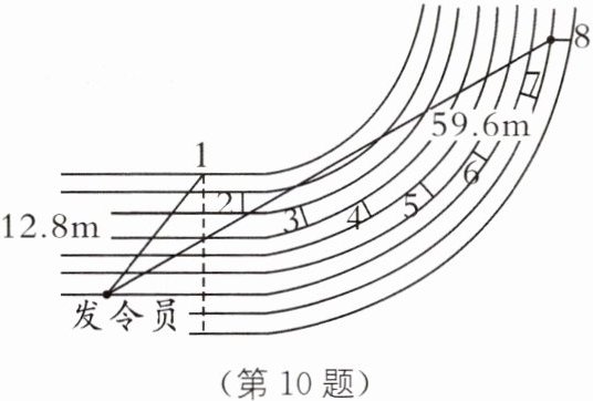 10. 某中学运动会男子400米比赛时,发令员在起跑线后方某处,运动员在各自赛道的起点处等待发令,如图所示,发令枪响的同时有闪光,下列判断正确的是(