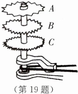 19. 如图所示是安装在同一根轴上的三个发声齿轮. 轴可以在外加动力下匀速转动,将硬纸片放在齿边可以发声.