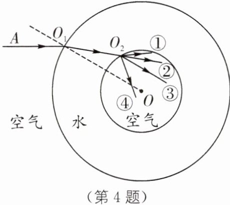 4. 在天宫课堂中,航天员将空气注入水球,形成的气泡球与水球的球心都在O点,一束光线从空气射入水球的光路如图所示,其中球心O与入射点$O_{1}$的连线为法线,则进入气泡球的折射光线可能为(