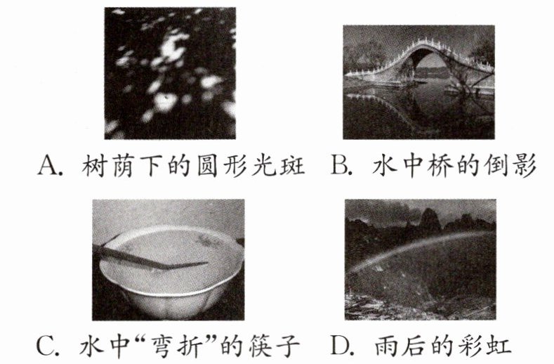 3.A [解析]本题考查光的直线传播、光的反射、光的折射现象.小孔成像是光沿直线传播形成的.树荫下的圆形光斑是太阳的实像,也是光沿直线传播形成的,与小孔成像现象原理相同,故A正确;水中桥的倒影是由光的反射形成的,故B错误;水中的筷子“弯折”,是因为光从水中斜射向空气的过程中发生折射现象,眼睛在折射光线的反向延长线处看到的虚像,是由光的折射形成的,故C错误;彩虹是自然界中光的色散现象,是由光的折射形成的,故D 错误.