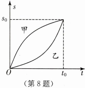 8. 甲、乙两辆赛车在赛道上行驶,在 0~t₀ 时间内通过的路程均为 s₀,此过程中两车通过的路程 s 与时间 t 的关系如图所示,下列说法中正确的是(