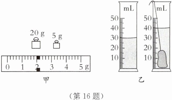 16. 小明测量某种矿石样品的密度,天平平衡时右盘所加砝码及游码的位置如图甲所示,图乙是矿石样品放入量筒前后的情况,由测量可得矿石样品的质量为
