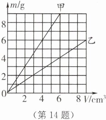 14. 小明在探究甲、乙两种不同物质的质量和体积的关系时,得出了如图所示的图像。由图像可知,甲、乙两种物质的密度之比$\rho_{甲}:\rho_{乙}$=