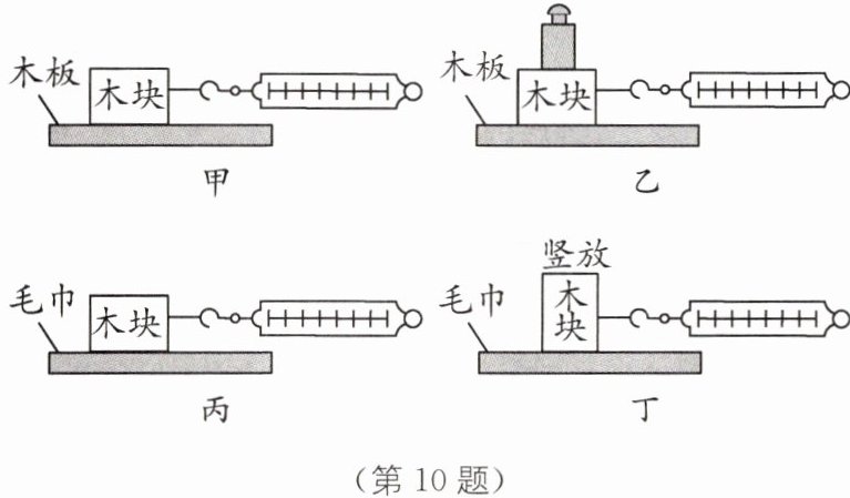 10. 如图所示是小明在探究“影响滑动摩擦力大小因素”时设计的实验方案. 以下说法正确的是(
