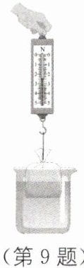 9. 在一只烧杯内装有密度为$\rho_{A}$的液体$A$,在一只轻薄透明塑料袋中装有大半袋密度为$\rho_{B}$的液体$B$,按如图所示的方式,用弹簧测力计吊住塑料袋并将塑料袋缓慢浸入液体$A$,测力计示数一直减小,当示数减为零时(塑料袋不接触杯底),有以下两个判断: