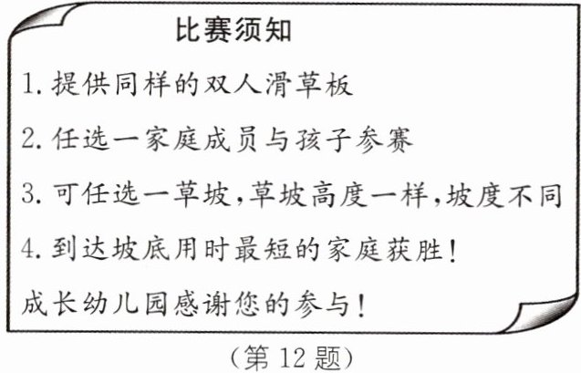 12. 六一儿童节前夕,小明妹妹所在的幼儿园将要举办“亲子滑草”比赛,比赛须知如图所示。为了赢得比赛,他们全家进行了讨论。小明认为:高度一定,越陡的坡用时应越短,要选择最陡的坡。妈妈认为:体重越大,滑行用时越少,应让体重最大的爸爸和妹妹参加。请你选择小明或小明妈妈的观点设计一个实验进行探究,为优化参赛方案提供建议。