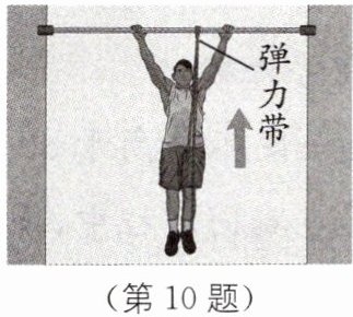 10. 引体向上是泰州市体育学业水平测试项目之一。如图所示,臂力小的小明借助弹力带进行训练,他用脚蹬弹力带,弹力带对他施加一个向上的力。随着小明身体上升,弹力带对他向上的力的大小变化情况是__