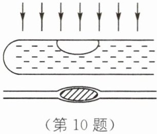 10. 如图所示,在注有清水的试管内留有一稍大的空气泡,使太阳光从试管的正上方向下照,观察试管下方的白纸,可以发现白纸上与空气泡相对应的位置上,有一椭圆黑影,而其他部分竟是一条与试管平行的亮线.这是因为试管充满水的地方相当于