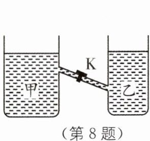 8. 如图所示,甲、乙两容器间用一细管相连,在细管上有一阀门K将两容器分开.现在甲中装水,乙中装浓盐水,且使两容器液面相平,然后打开阀门K,则斜管中液体的流动情况是(