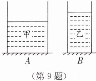 由 $ p_{甲} = p_{乙} $ 可得 $ \rho_{甲} gh_A = \rho_{乙} gh_B $,由图可知 $ h_A < h_B $,所以 $ \rho_{甲} > \rho_{乙} $。