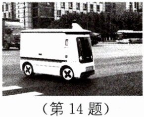 14. 如图所示是一辆无人配送车. 若该无人配送车装运快递后的总重为6000N,在某小区的平直道路上匀速行驶了60m,用时40s,此过程中受到的牵引力为600N,轮胎与地面接触的总面积为$800cm^2. $通过计算回答:该无人配送车在40s的时间里,