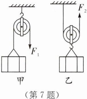 7. (多选)如图所示,小明用相同的滑轮安装成甲、乙两种装置,分别匀速提升两个质量相同的物体,绳端在相同时间内移动的距离相等。在提升过程中,若绳端拉力$ F_{1} : F_{2} = 3 : 2 $,下列说法正确的是(