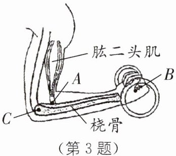 3. 如图所示,小明用手提起哑铃,这一动作从生物学的视角,可以认为桡骨在肱二头肌的牵引下绕着肘关节转动;从物理学的视角,可以认为是一个杠杆在工作。下列说法正确的是(
