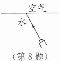 8. 如图所示,清澈平整水面下的“射灯”射出一束光从水中斜射到水与空气的界面时将发生反射和折射.若入射光线与界面成53°角,反射光线与折射光线夹角为100°,则反射角大小为______