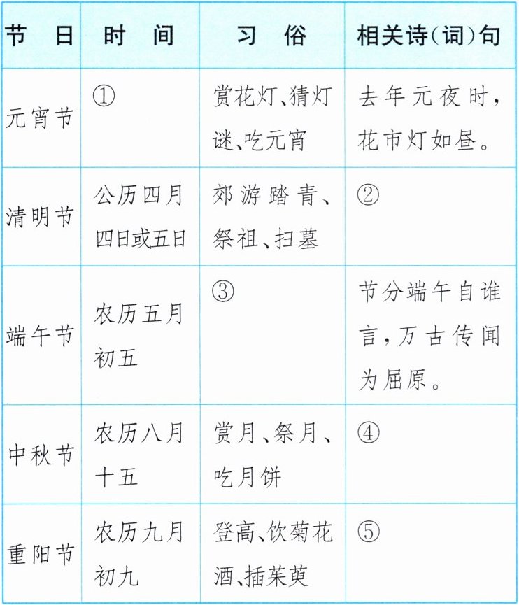 (1) ① 农历正月十五 ② 示例:清明时节雨纷纷,路上行人欲断魂。 ③ 示例:赛龙舟、吃粽子 ④ 示例:今夜月明人尽望,不知秋思落谁家。 ⑤ 示例:遥知兄弟登高处,遍插茱萸少一人。