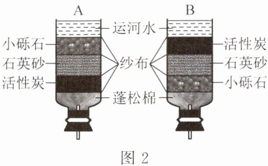 的结构,可以吸附色素和异味分子。(2)净化:将饮用水瓶和纱布、活性炭等组合成如图2所示的装置进行水的净化。其中,装置制作较合理的是