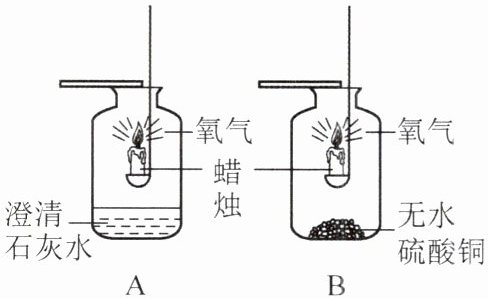 5. 如图所示,A、B两个集气瓶中充满氧气,瓶底分别装有澄清石灰水和无水硫酸铜(无水硫酸铜为白色固体,遇水会变成蓝色)。某化学兴趣小组为探究蜡烛燃烧的产物,设计了下列实验: