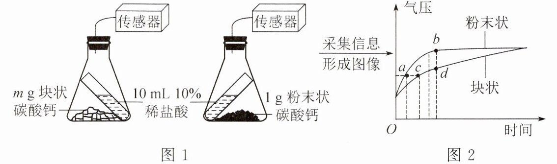 9. 某校化学学习小组利用二氧化碳的制取实验探究不同形状的碳酸钙对反应速率的影响。小组同学利用数据传感技术比较块状和粉末状的碳酸钙与足量的稀盐酸反应的快慢。按图1所示装置装好试剂,通过一定操作使$10\ \text{mL}$稀盐酸(足量)与固体充分接触,得到瓶内气压随时间的变化情况如图2所示。