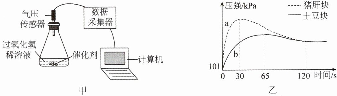 3.(2024·烟台节选)兴趣小组用图甲所示装置探究不同催化剂对过氧化氢分解的催化效果。取大小相同的新鲜土豆块和新鲜猪肝块作催化剂,分别加入10mL相同浓度的过氧化氢稀溶液后,用传感器测量装置中气压的变化,如图乙中曲线a、b所示。