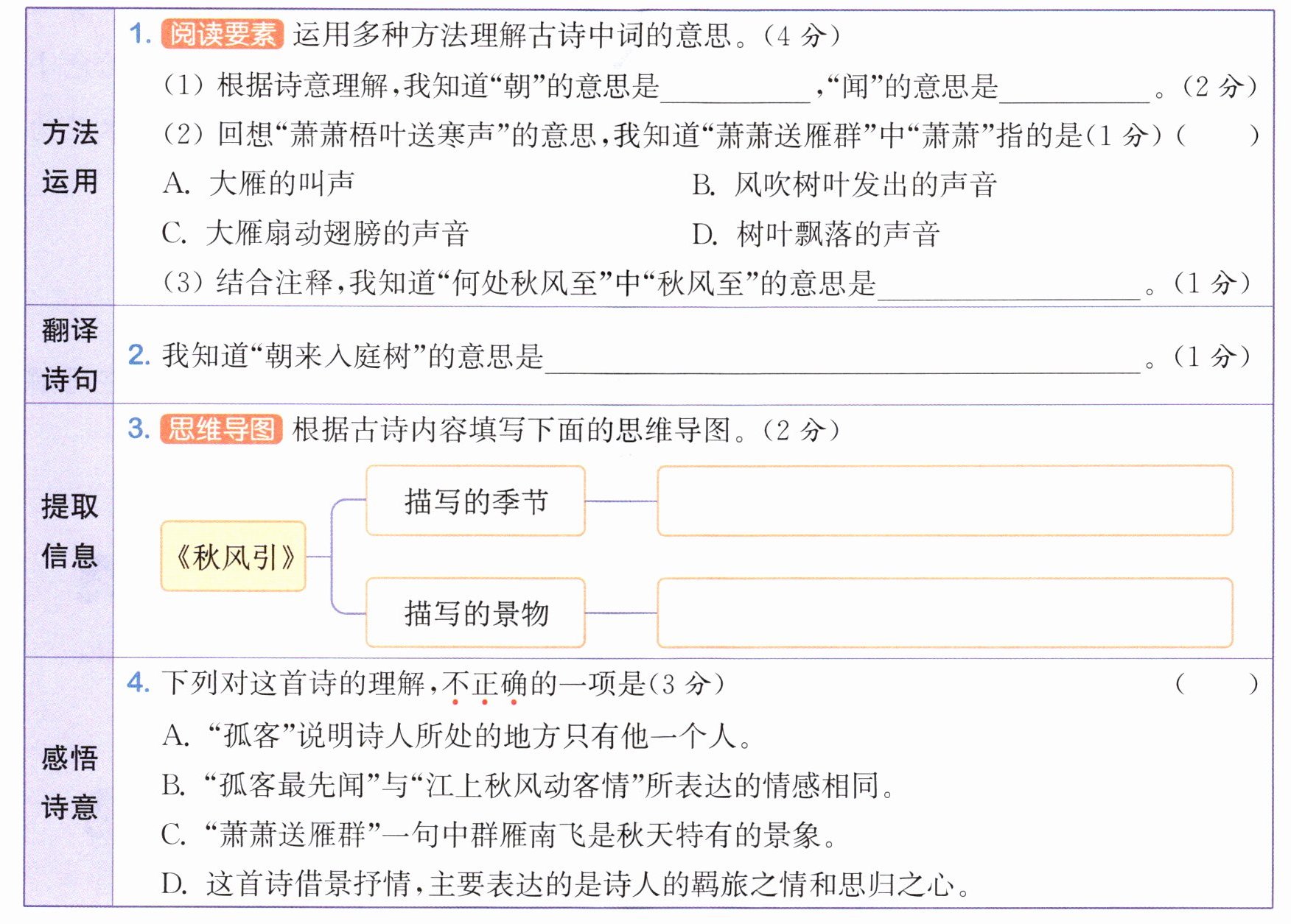 1.(1)早晨 听到(每空1分) (2)B(1分) 解析:"萧萧梧叶送寒声"中"萧萧"是形容风吹梧桐叶发出的声音,迁移至本诗理解即可。 (3)秋风到来(1分) 2. 早晨,秋风吹动着庭院里的树木(1分) 3. 秋季 秋风、雁群、庭树(每空1分) 4. A(3分) 解析:"孤客"并不是指诗人所处的地方只有他一个人,而是指诗人独居异乡感到孤单,非常思念家乡。