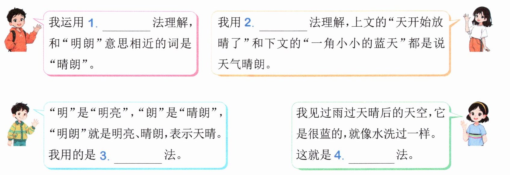1. D 2. B 3. A 4. C 解析:近义词替换:左边第一个同学通过和“明朗”意思相近的词“晴朗”来理解,这是运用了近义词替换的方法。联系上下文:右边第一个同学借助上文“天开始放晴了”和下文“一角小小的蓝天”这些语境信息来理解“明朗”,属于联系上下文的方法。分解组合:左边第二个同学把“明朗”拆成“明”和“朗”分别解释,再组合起来理解词意,这是分解组合的方法。联系生活实际:右边第二个同学根据自己见过雨过天晴后天空的样子来理解“明朗”,运用的是联系生活实际的方法。