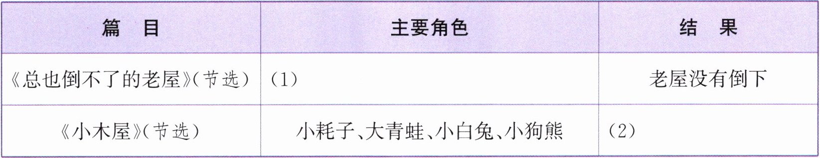 1. (1)老屋、小猫、老母鸡、小蜘蛛 (2)大家一起盖了一间更好更大的新小木屋