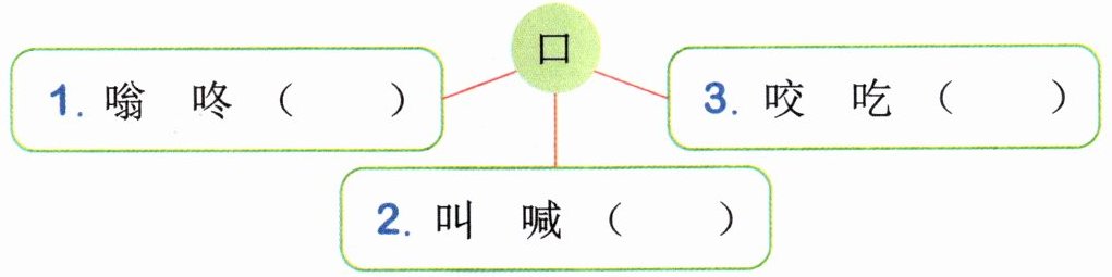 三、【偏旁家族大分类】依据汉字分类规律,将“咽”“喵”“唱”三个汉字填写到相应的括号中。