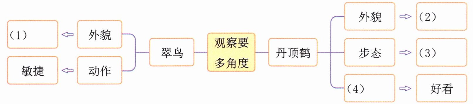 (1)思维导图翠鸟是怎样捕鱼的?摘录关键动词,填在下面的思维导图中。(2分)