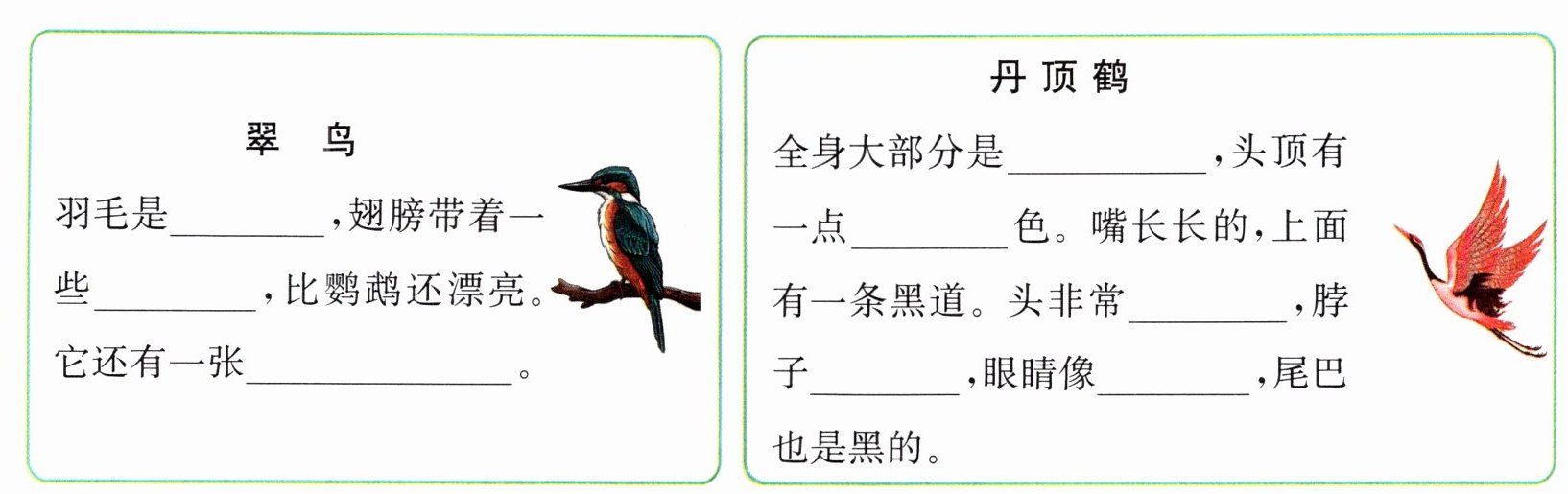 1.(1)美丽 (2)美丽 (3)优雅 (4)休息时的姿态(每空1分) 2. 翠绿的 蓝色 红色的长嘴 雪白的 朱红 小 黑、长 小豆豆(每空0.5分) 3.(1)飞 衔 站 吞(每空0.5分)(2)一下子 没一会儿(每空1分)
