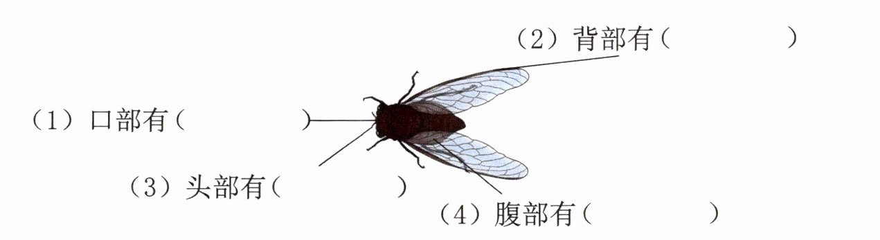 1. 阅读要素 小语从几张照片当中挑选出了一张近距离拍摄到的雄蝉的照片,并给同学们指明了雄蝉身上的关键部位。(4 分)