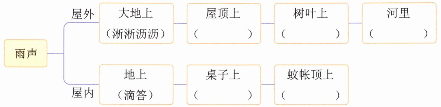 1.雨落在不同的地方,发出了怎样的声音?(找出拟声词填一填)(5分)