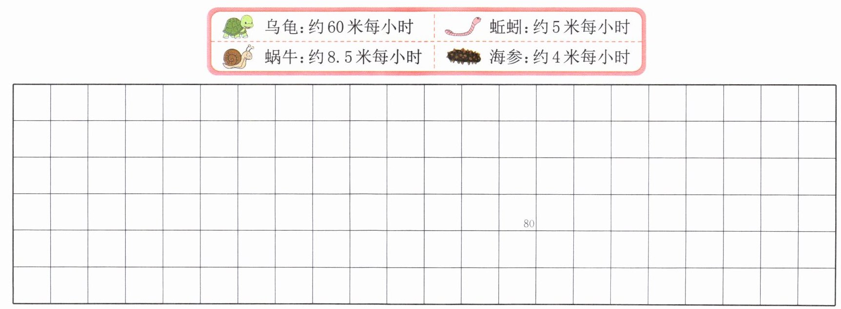 示例:什么比乌龟的速度更慢呢?我们首先想到的是蜗牛。乌龟在爬行的时候,速度约 60 米每小时。蜗牛的速度要是跟乌龟比起来,简直可以说是静止的——蜗牛的速度约 8.5 米每小时。