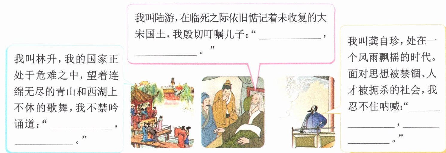 1. 看不到国家统一 收复失地、祖国统一 2. 临安旅店 杭州 汴州 3.(1)渴望收复中原的热切心情 (2)对当政者不思收复失地的激愤以及对国家命运的担忧