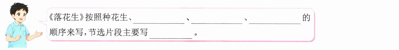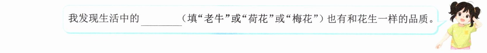 1. 味道美 可以榨油 价钱便宜 不好看但很有用(每空1分) 2. 收花生 尝花生 议花生 议花生 老牛(每空1分) 3. C(3分) 解析:结合选文"花生的好处很多……必须挖起来才知道""所以你们要像花生,它虽然不好看,可是很有用"可知,父亲是想"我们"像花生一样,成为对社会有用的人。