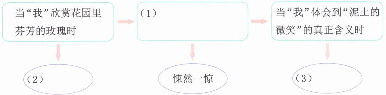 1. B(3分) 解析:结合第③自然段中"千万不能剪啊,玫瑰是泥土的微笑",第⑤自然段中"其实这不过是一杯泥土,经过窑烧才千修百炼成瓷中经典",第⑥自然段中"江南的紫砂壶玲珑有致,泥人张的彩塑令人拍案叫绝,它们不都是泥土的微笑吗"可知,"泥土的微笑"在文中指的是玫瑰花、花瓶、紫砂壶、彩塑。 2.(1)当朋友不肯采摘,认真叮咛"我"时 (2)欢喜不已 (3)肃然起敬(每空1分) 3. C(3分) 解析:结合第③自然段中"朋友急忙拦住,高声叫着:'不可,不可!这么美丽的玫瑰剪下来,让人心疼。'她抓紧我的袖子叮咛:'千万不能剪啊,玫瑰是泥土的微笑,谁忍心杀戮美得醉人的微笑?'",第④自然段中"丑陋的泥土,卑微的泥土,朴素的泥土,因为玫瑰,露出了惊艳一笑。因为这一笑,让人爱惜非常"可知,让"我"的灵魂悚然一惊的原因:泥土虽然丑陋、卑微、朴素,但是它的"微笑"是美丽、华贵、流光溢彩的,"我"从好友的话中体会到了泥土因玫瑰而美丽,玫瑰因泥土而真实,所以"我"的灵魂悚然一惊。 4. C(3分) 解析:结合文章可知,泥土因培育了这些事物,让这些事物能展现出它们的美丽,从而让人肃然起敬。 5. 示例:人没有高低贵贱之分,即使再平凡的人,只要努力奋斗,活出精彩,就一定会叫人刮目相看。(2分)6.(1)都借助了具体的事物抒发情感。(1分)(2)这样表达不空洞,可以使要表达的情感有所依托,生动具体,容易引发读者的共鸣,增强文章的表现力和感染力。(2分)