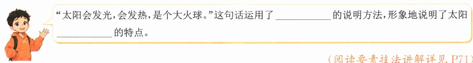 1. 羿射九日(2分) 2.(1)约有一亿五千万千米远 (2)约一百三十万个地球的体积 (3)五千多摄氏度(每空1分) 3. 列数据 举例子 列数据 作比较 体积大 打比方 温度高(每空1分)