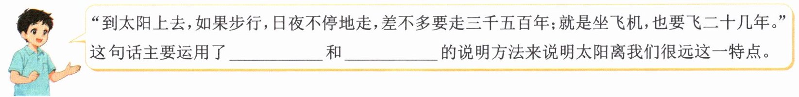 “我们看到太阳,觉得它并不大,实际上它大得很,约一百三十万个地球的体积才能抵得上一个太阳。”这句话主要运用了 ____ 和 ____ 的说明方法,体现了太阳 ____ 的特点。