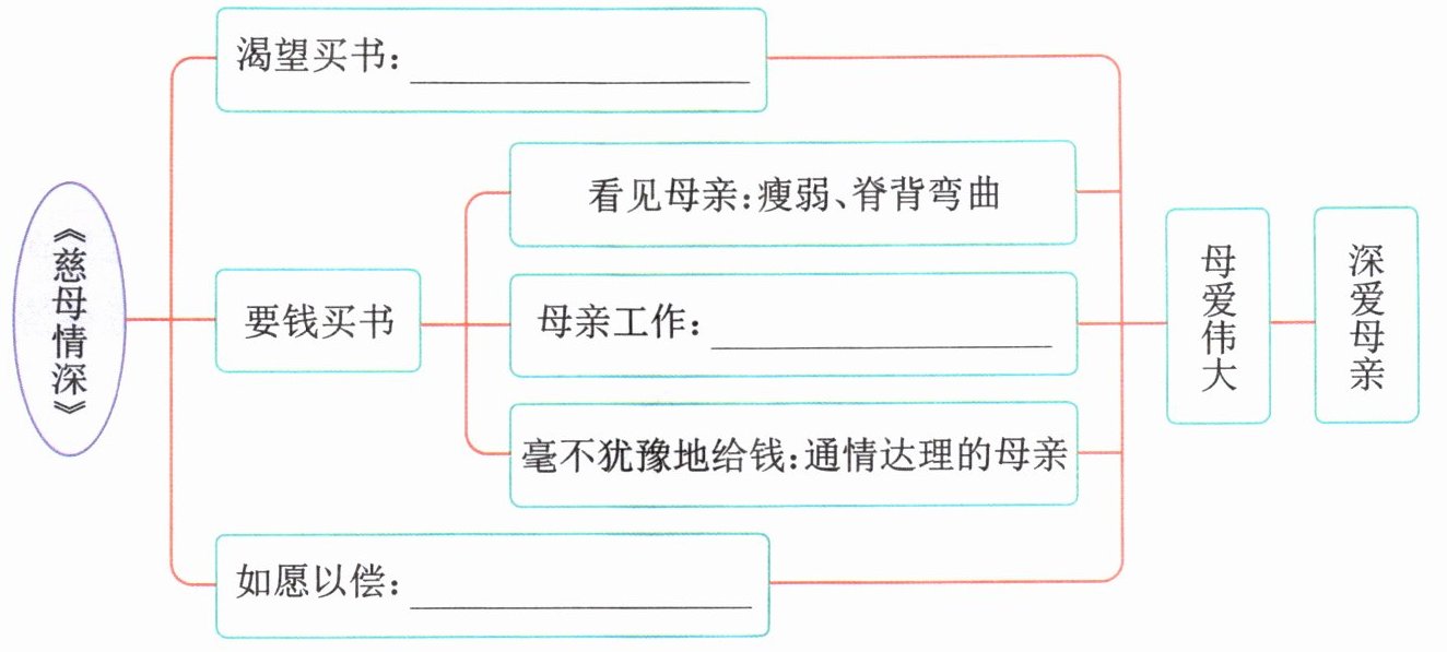 |工作辛劳、工资微薄|母亲给的买书钱(1)______|通过对比,我发现这是一位(3)______的母亲。|