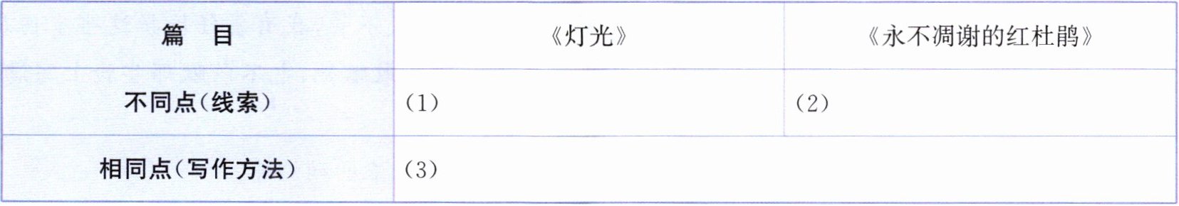5. 链接教材 本文与课文《灯光》在写作方法、贯穿全文的线索上有哪些异同点?想一想,完成下面的表格。(3 分)