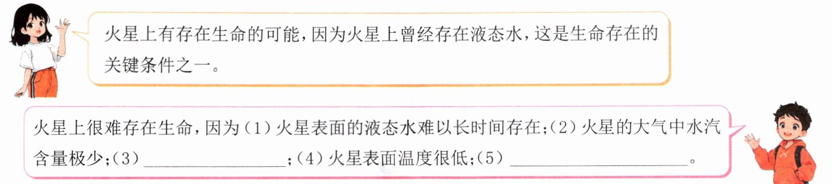 2. 火星是否有存在生命的可能性,在班级讨论会上,大家正激烈地讨论着,请你结合选文内容帮助他们把对话补充完整。