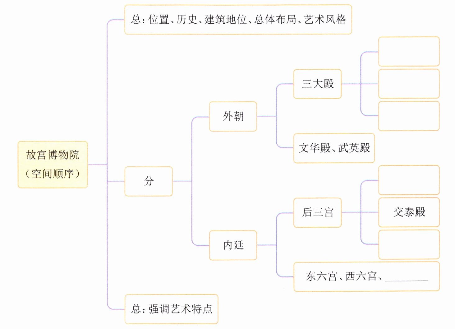 三、小语想借助《故宫博物院》一文向家人介绍故宫的布局,请你帮他完成思维导图。