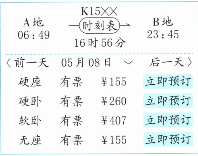 3. 赵叔叔一家和张叔叔一家都从A地出发,乘坐本次列车去B地旅游,赵叔叔买了4张硬卧票,张叔叔买了3张软卧票。谁买票用的钱多?多多少元?