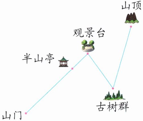 4. 下面是某景区的旅游景点布局图。从山门到半山亭的路程约为3千米。请估一估,从半山亭到观景台大约是(